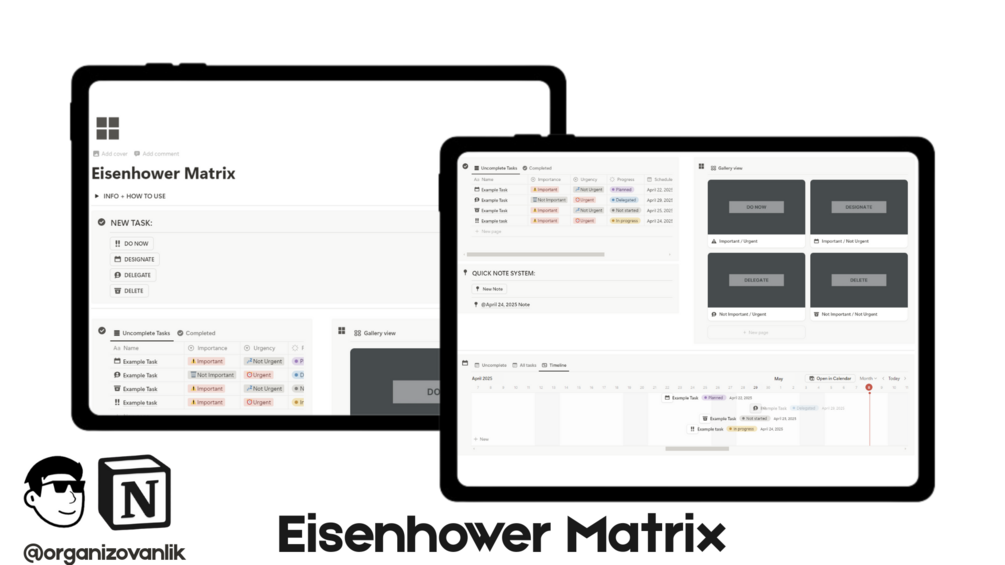Best way to manage your tasks and be productive - the Eisenhower Matrix! Mark your tasks as Important or Not important, as Urgent or Not Urgent. Then work on them based on Urgency and Importance. With this Mono and Minimalist look you will be 100% focused on your tasks and your work!