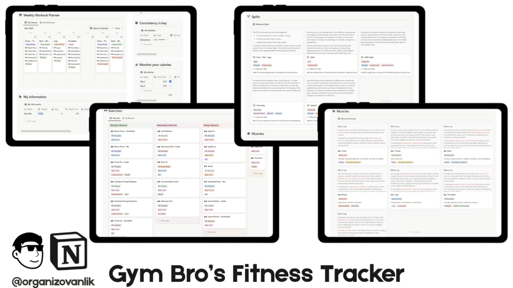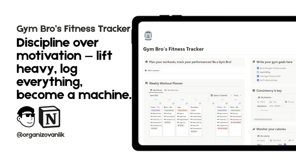Gym Bro’s Fitness Tracker is not just a workout log — it’s your ultimate digital gym partner. Designed for lifters who value structure, progress, and aesthetics, this Notion template gives you full control over your training, nutrition, and long-term goals.